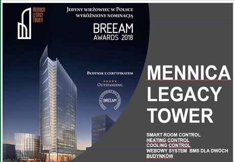 Sterowanie oświetleniem wewnętrznym i zewnętrznym, klimakonwektormi dla cz. wspólnych, system BMS obejmujący: centrale wentylacyjne, AWL, liczniki mediów, monitoring instalacji elektrycznych, CO2, analizatory parametrów sieci, węzeł cieplny, ogrzewanie podłogowe, kurtyny, nagrzewnice strefowe, SZR, iluminacja korony budynku. 14 kondygnacyjny budynek o powierzchni 25 165 mkw. Certyfikat BREEAM Excellent.
